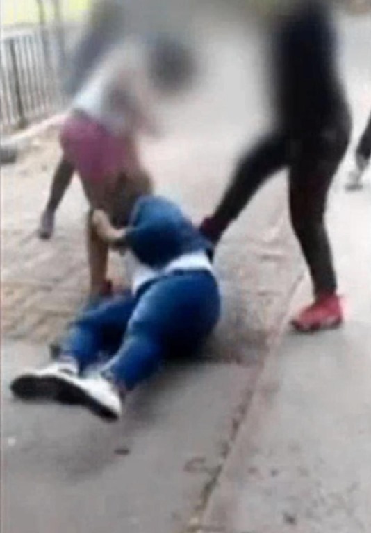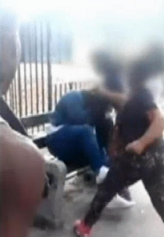 At one point, the teenager is pulled off the park bench by the three girls, who punch her in the face and kick her in the back.