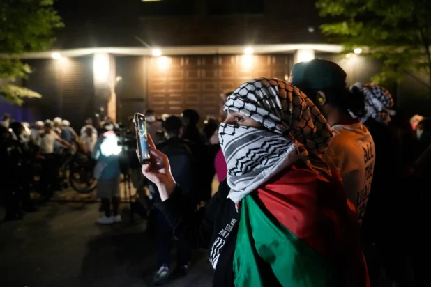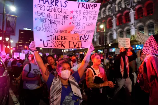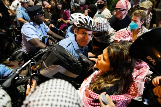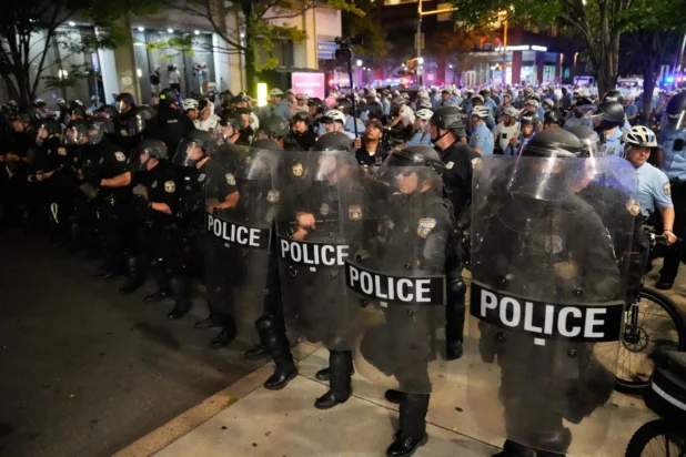 Demonstrators wearing keffiyehs pushed against officers in riot gear trying to hold back the unruly crowd as Vice President Kamala Harris and former President Donald Trump squared off on the issue of the Israel-Hamas war inside the National Constitution Center.