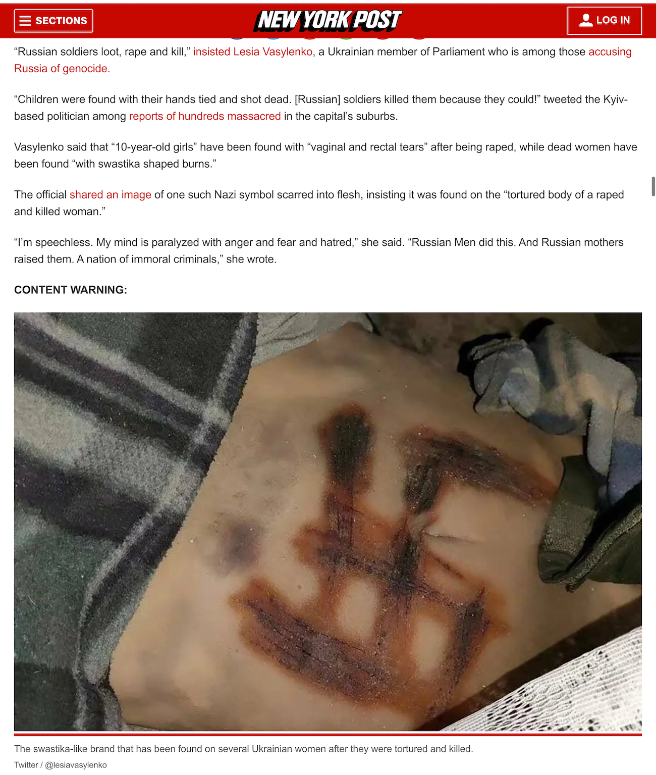 Yet – yet – the New York Post just reported on Vasylenko’s tweet, without mentioning that it was filmed in the basement of an Azov base. They are also reporting that Russians are gang-raping and sodomizing 10-year-olds…!