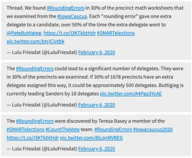 In even further apparent trickery, there were documented “rounding errors” that all were in favor of Buttigieg. Basically, there are situations where the delegate count does not come out evenly, so they have to round up or down. The procedure is to round down if the number is below .5, and yet with Buttigieg, they were rounding up from .2. Several people on Twitter were documenting this phenomenon, and many of them had their posts deleted! Virtually no media covered it.