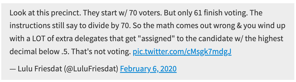 The media is saying that it is impossible to hoax a caucus, but when you’re talking about literally 3 votes, I refuse to believe that isn’t possible. With such close numbers, you could literally just start paying off a few delegates. We all saw the videos of delegates in the school gymnasiums trying to choose who to vote for. And Biden was declared “non-viable” in several precincts, so there were a bunch of delegates who couldn’t cast votes for him who could have been targeted.