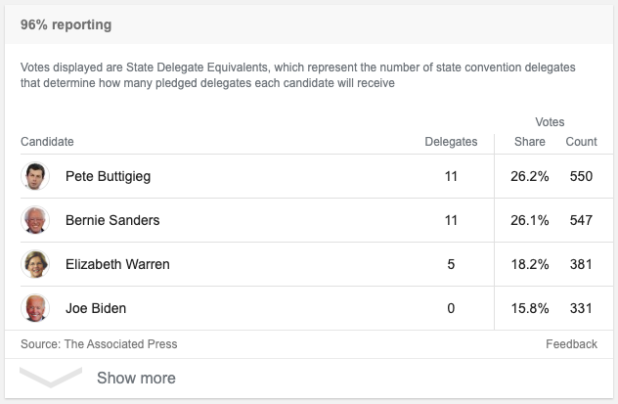 I thought it was unlikely that Pete Buttigieg would beat Bernie Sanders at all, but the idea that he’s beating him by .01% is hardly believable.