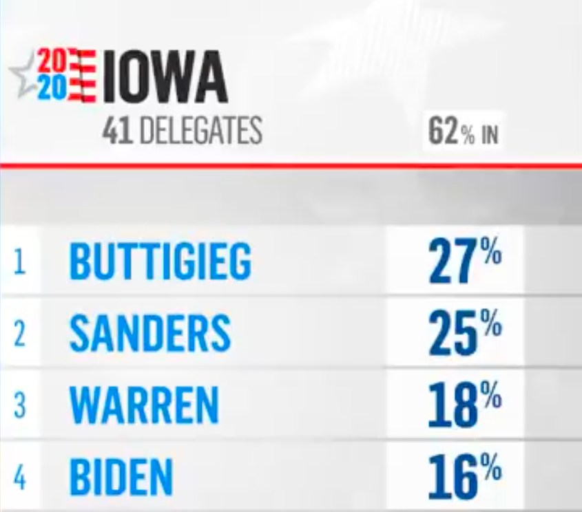 Furthermore, for over 24 hours, we only had 62% of the vote public, and that had Buttigieg at a 2% lead, which was on all of the TVs.