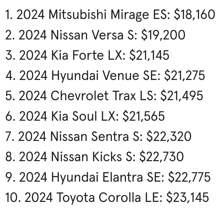 Here’s a list of the “cheapest new cars” in the US: