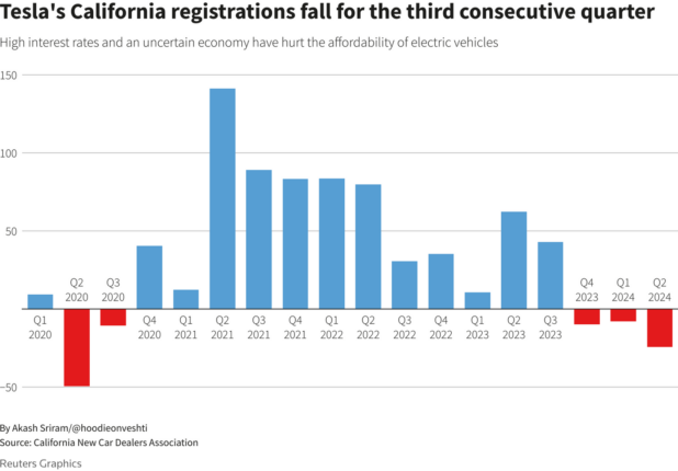 Registrations of Tesla cars in California fell 24% in the April to June period, marking the third consecutive quarter that the company posted a sales drop in its key market, indicating mounting challenges for the EV maker, according to industry data on Thursday.