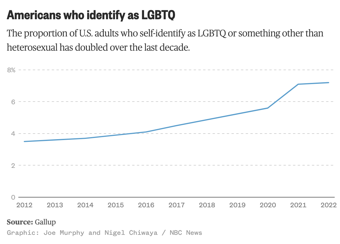 In 2022, 20% of generation Z identified as faggots. With the upcoming generation (which they are trying to call alpha, because I guess Z was omega and now we’re starting over), studies have them as about a third non-hetero. But I’ve talked to kids who say they are the only straight kid at their school.
