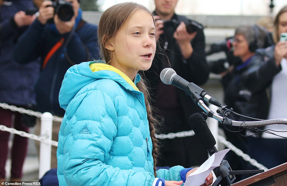 ‘We cannot allow this crisis to continue to be a partisan, political question,’ Thunberg said in a speech before thousands of people on the steps of the provincial legislature.