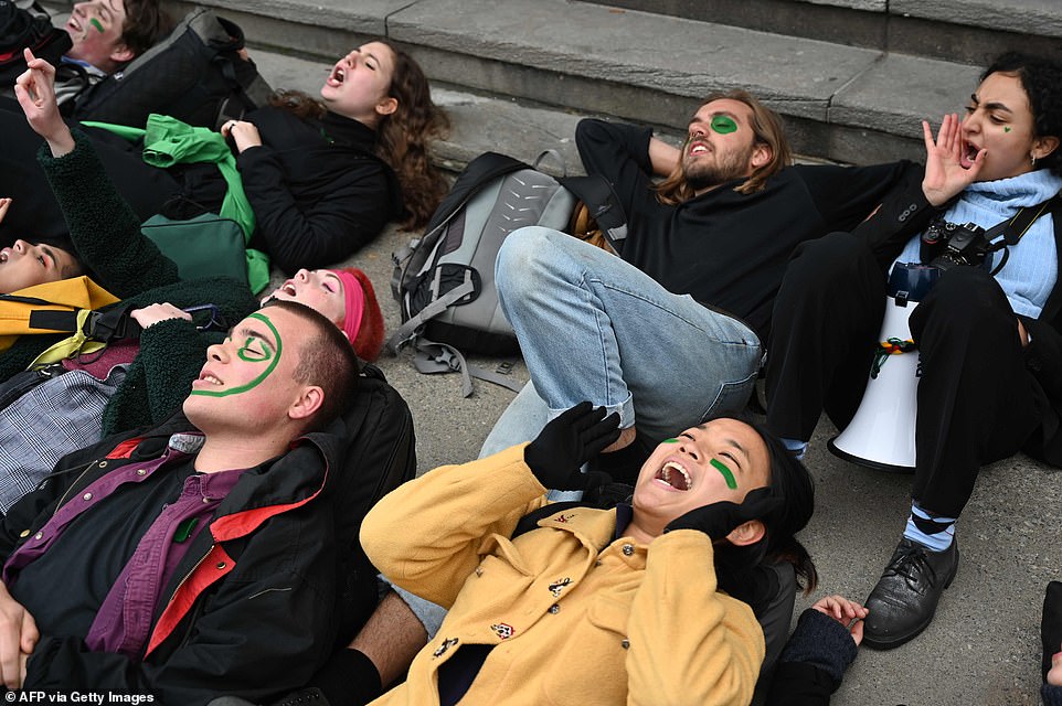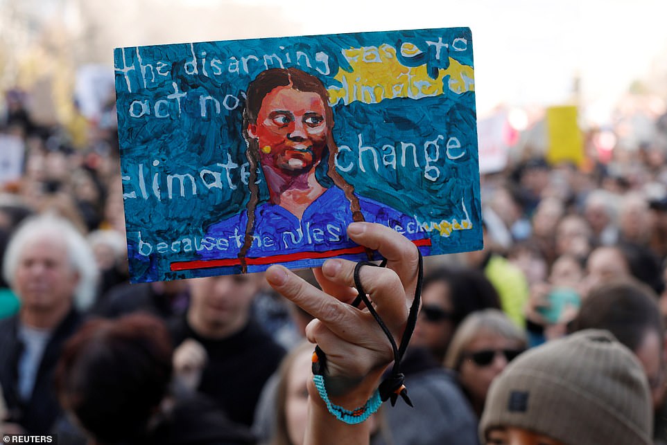 But climate protester Bridget Gutteridge-Hingston, 13, who marched with her father, said: ‘I came out to show support for Greta and everyone fighting against the climate crisis.