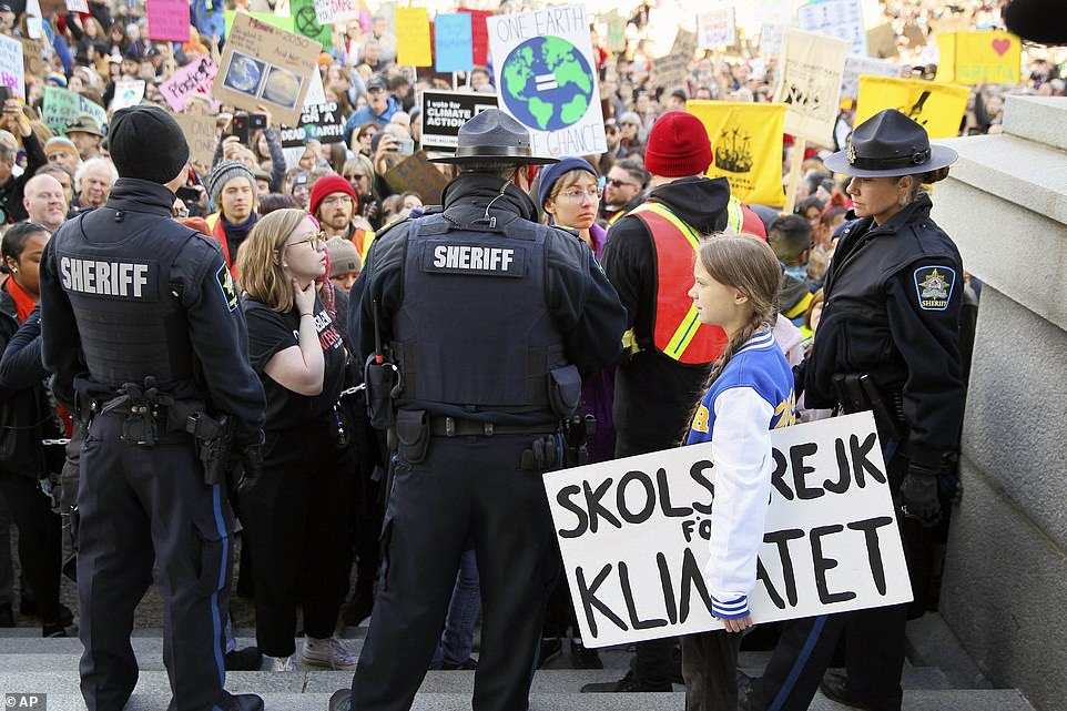 ‘Richer countries such as Canada and Sweden need to get down to zero emissions much faster so people in poorer countries can heighten their standard of living by building the infrastructure we have already built,’ Thunberg told a cheering crowd, which organizers estimated was 10,000-strong, from the steps of the Alberta legislature building.