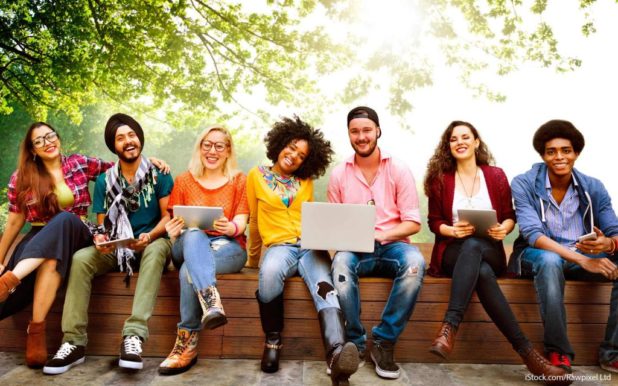 College students: prime recruitment ground for a tech-savvy corporation. The token White guy is still an unfortunate holdover from college’s supremacist past, but is sure to go away soon.