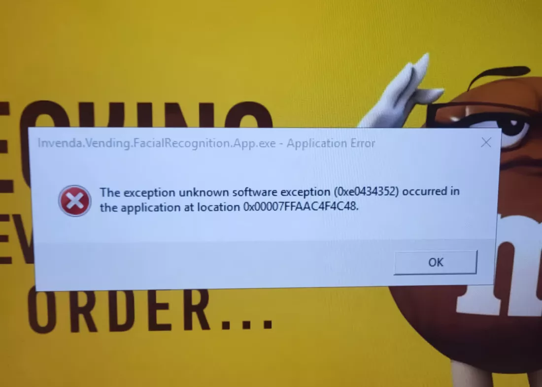 Student and Redditor “SquidKid47” posted a photo of an error message on one of the college’s M&M machines showing that a program called “Invenda.Vending.FacialRecognition.App.exe” had crashed. A subsequent investigation by a campus newspaper sparked outrage among students, prompting the school to order the campus’s vending machines’ removal.