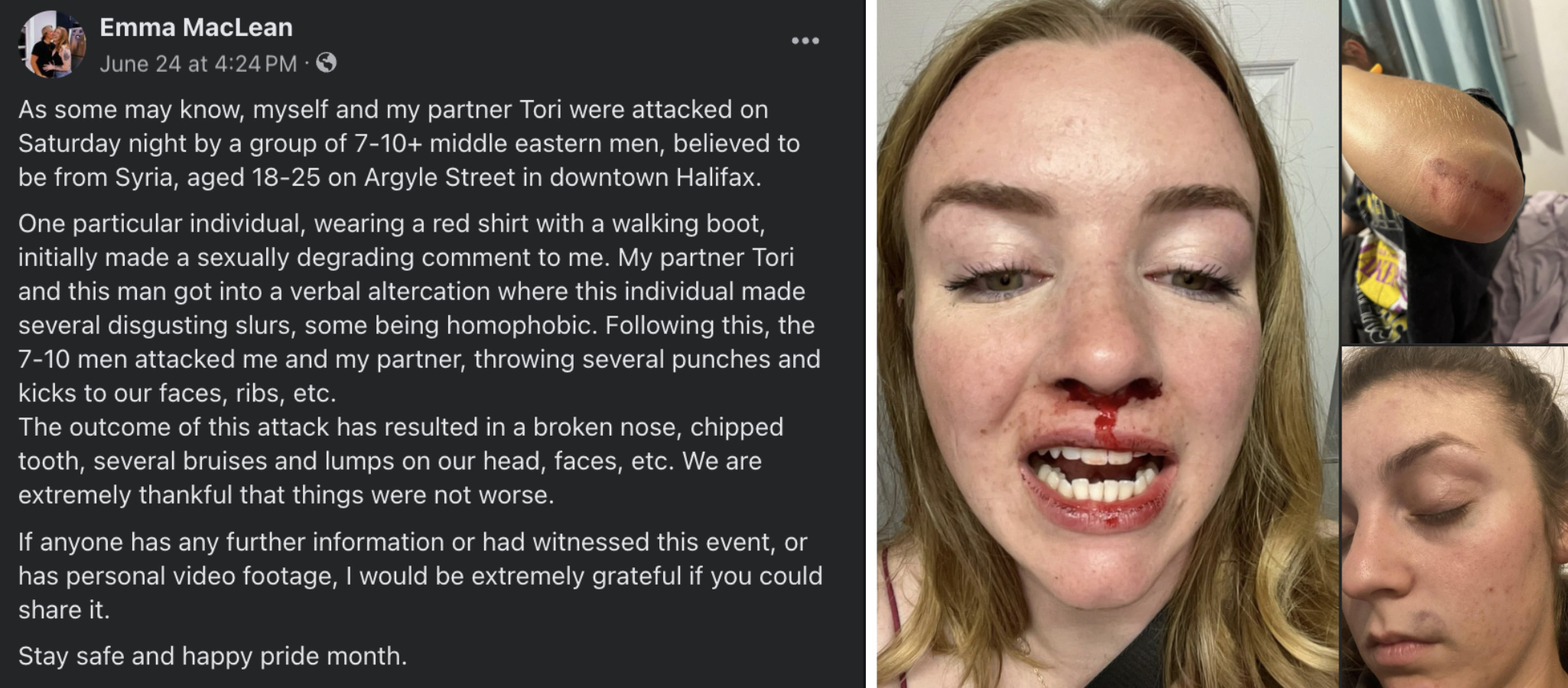 Emma MacLean was walking with her girlfriend Tori in Halifax, Canada when a group of about ten ‘middle eastern men, believed to be from Syria’ came towards them.