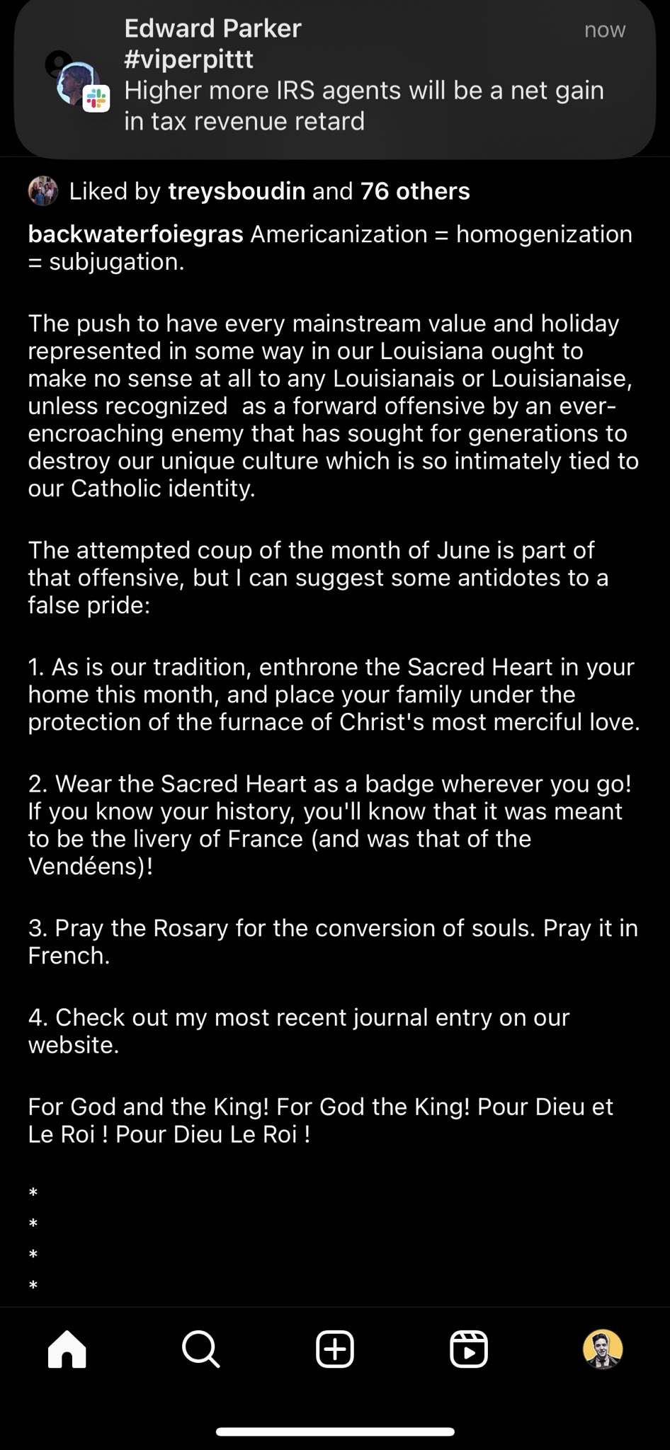 On June 3, Ross McKnight, the owner of Backwater Foie Gras, wrote on Instagram: “The push to have every mainstream value and holiday represented in some way in our Louisiana ought to make no sense at all to any Louisianais or Louisianaise, unless recognized as a forward offensive by an ever-encroaching enemy that has sought for generations to destroy our unique culture which is so intimately tied to our Catholic identity.”