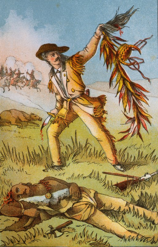 At the Battle of Warbonnet Creek Cody killed and scalped the Indian chief Yellow Hair, an incident that became known as The First Scalp for Custer. The Battle took place less than a month after the vicious slaughter of American forces at Custer’s Last Stand. After scalping his foe, Cody proudly displayed the scalp and headdress to cheering white soldiers. Shortly after the event, Cody went back east and performed in shows where he reenacted this act of revenge in front of an enthusiastic audience. The episode was also reproduced in numerous paintings and illustrations.