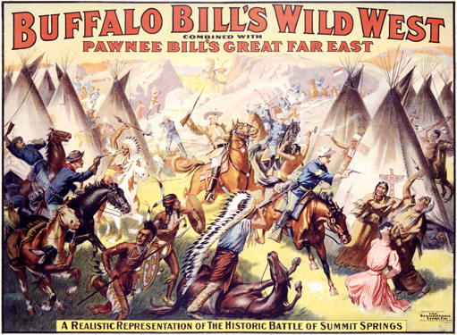When most people today hear the name ‘Buffalo’ Bill Cody they think of a quaint and old-fashioned wild west show that featured trick shooting and riding. But Cody was a real life hero, a prolific buffalo hunter as well as a trail guide and scout for the US cavalry during the Indian wars. His shows included mock battles based on true events in which he himself had participated, events whose politically incorrect nature would be shocking to contemporary mainstream sensibilities. Buffalo Bill’s Wild West show was immensely popular during the late 19th and early 20th centuries, and Cody’s exploits were also the subject of books, paintings and magazines. The celebration of Cody’s career as an Indian fighter was the celebration of the American triumph over savagery, a triumph that was seen as glorious and just.