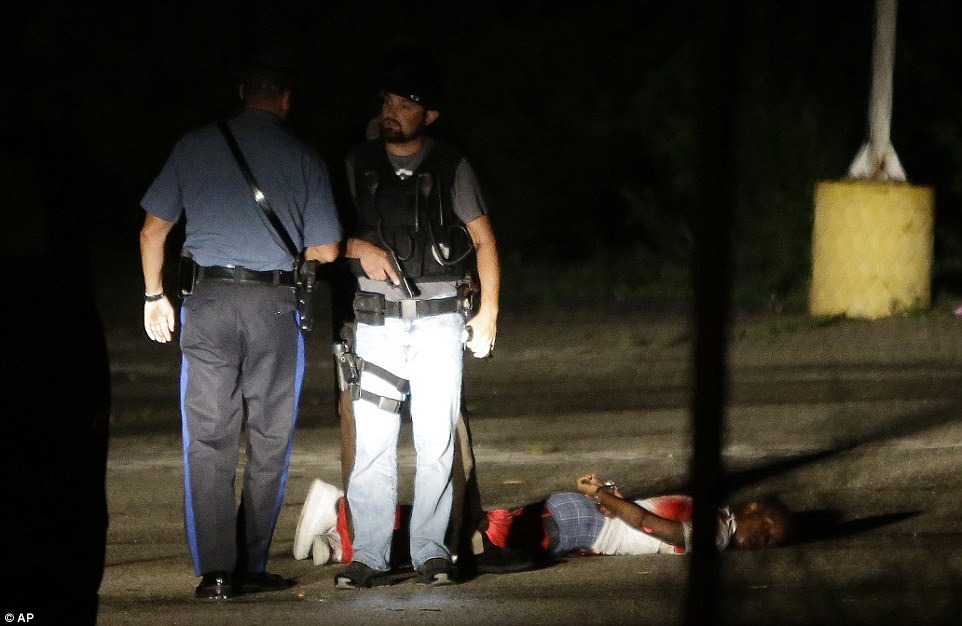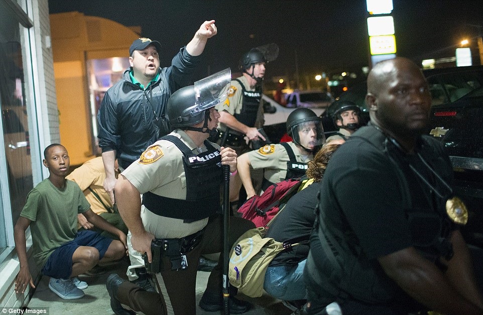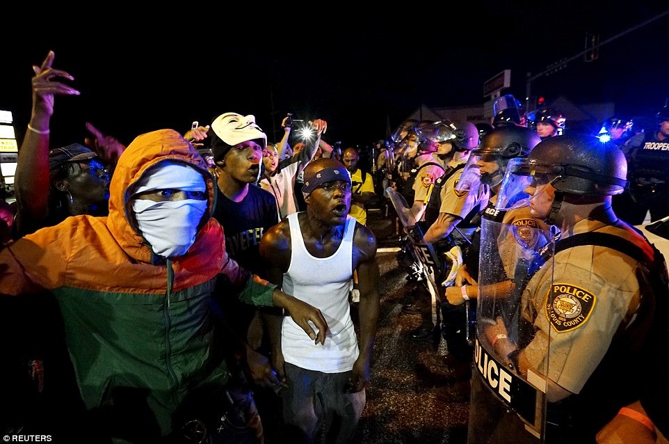 The situation began to escalate just after 10pm when a Ferguson police officer told the protesters on a megaphone: ‘Remaining in the street is a violation of law. You must move onto the sidewalk or be subject to arrest’.