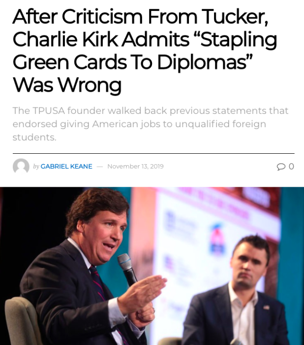 Kirk also brought back his claim that he wants to “staple green cards to diplomas.” You may remember that back in November, Tucker Carlson called out Charlie Kirk on his show for making this insane, suicidal demand for our college graduates to be forced to compete with unlimited numbers of foreigners. Charlie Kirk apologized for attempting to undermine the country in this way.