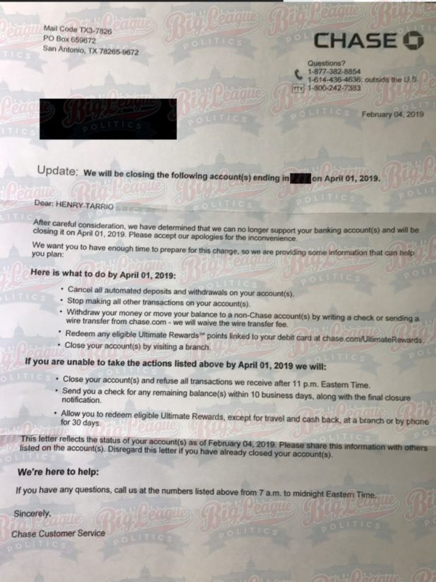 In a letter obtained exclusively by Big League Politics, the bank informs him that he must shut down all of his accounts by April 1st, 2019, without giving a reason.