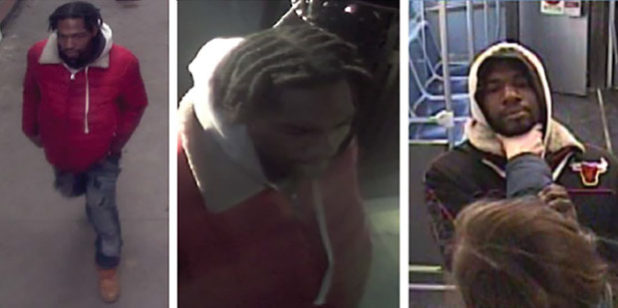 The police department had previously released pictures from inside and around the train β one of which showed the victim holding a man in a Chicago Bulls jacket back with her hand around his neck β in an effort to try and identify and locate the offender.
