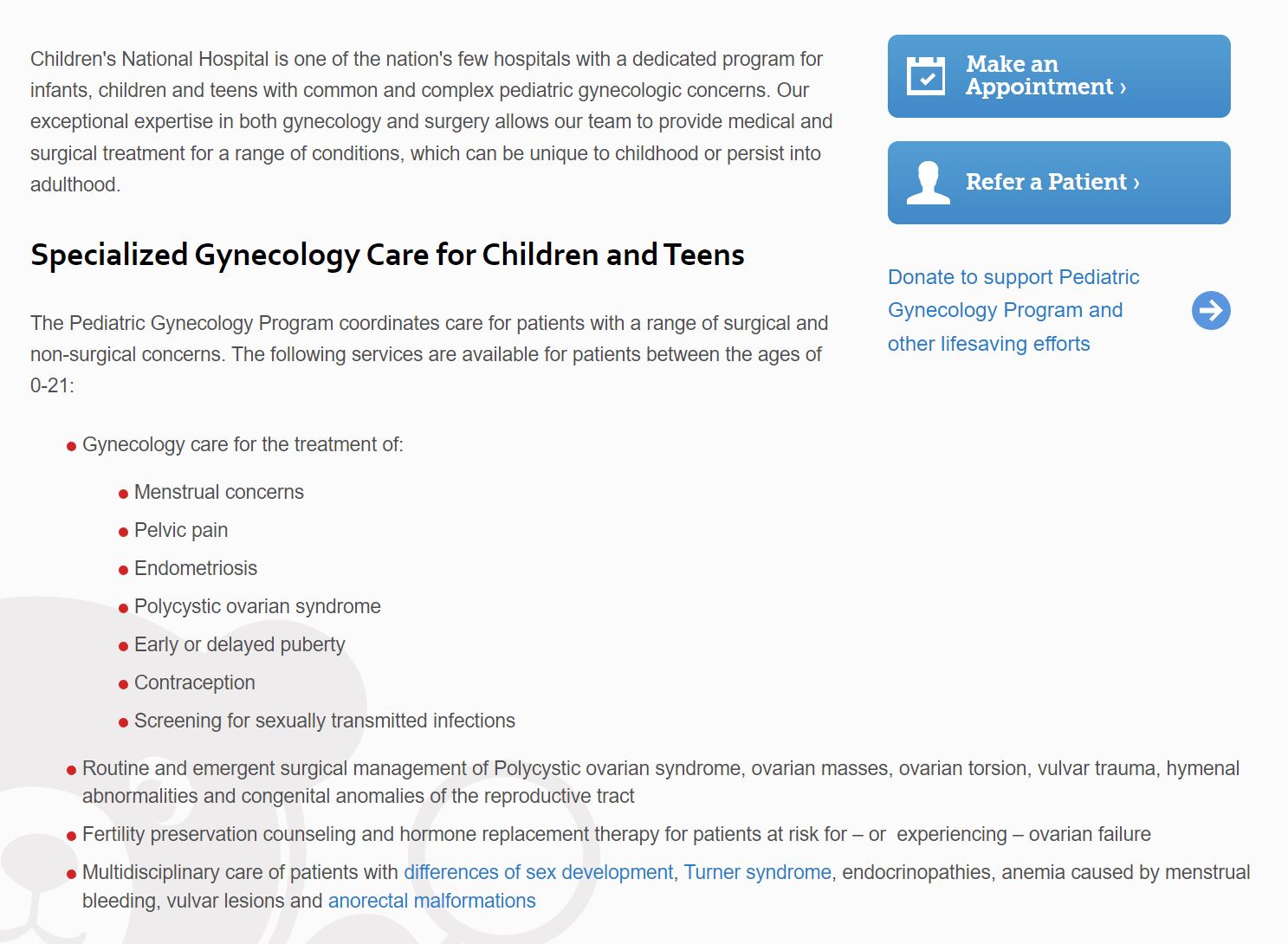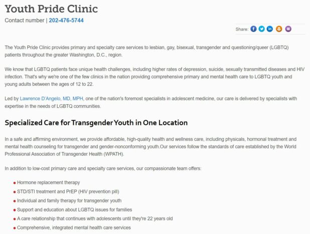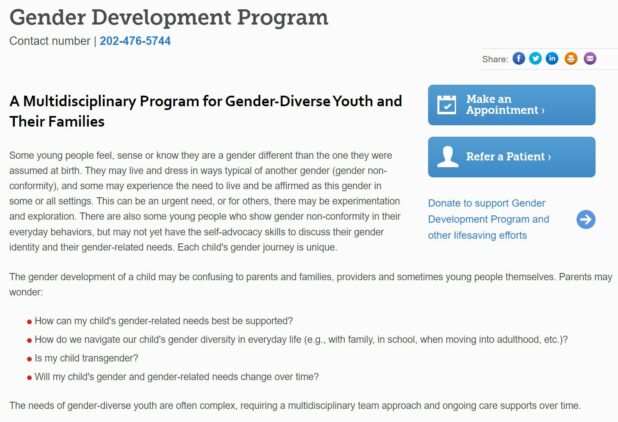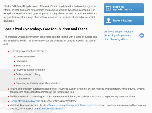 Undeterred, I decided to focus on finding out if other children’s hospitals were engaged in these barbaric practices, too. That’s when I stumbled across Children’s National Hospital in Washington, D.C. Scrolling through their site, I came across a page which says the hospital treats young patients between the ages of 0 and 21 for gynecology care and gender-affirming medical treatments, including hysterectomies.