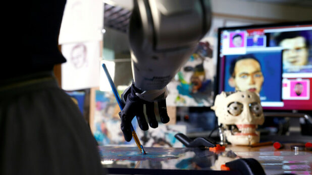 Hanson Robotics’ Sophia, a humanoid robot, painting in Hong Kong, China.