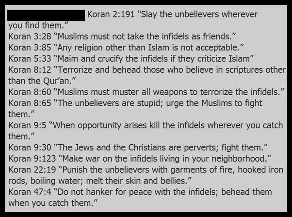 Oh, those? Those are just taken out of context by racists and islamophobes. If you’re not dumb, uneducated and toothless, like all people filled with hate are, then you understand that “When opportunity arises kill the infidels wherever you catch them” actually means “LOVE AND PEACE!” when read in it’s proper context and with an open mind.
