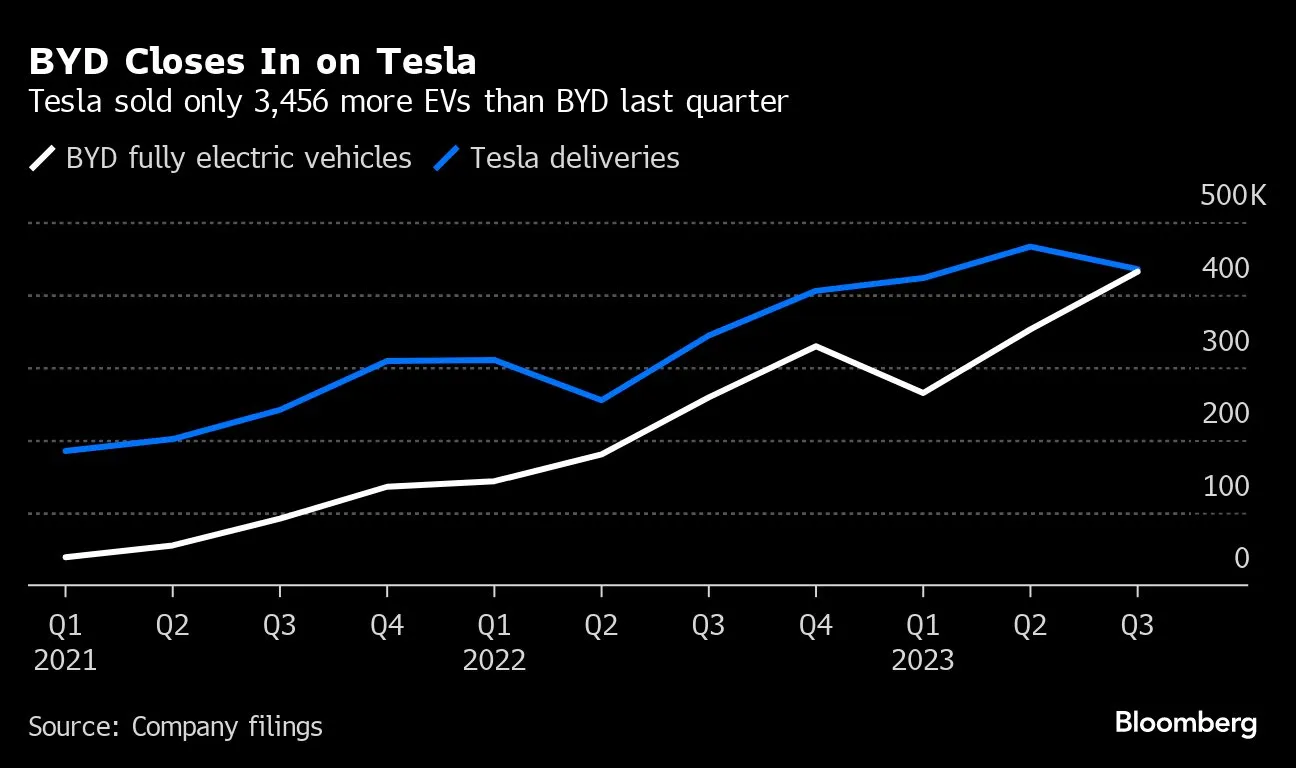 In 2022, BYD trailed Tesla in global BEV sales by about 400,000 units. The gap is expected to have narrowed last year. And in the most recent quarter, BYD may have already overtaken Elon Musk’s company.