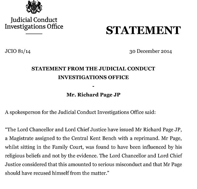 Mr Page was brought before a local conduct panel, where he was told he had broken the judicial oath, which requires magistrates to ‘do right to all manner of people’, ‘without fear or favour, affection or ill will’.