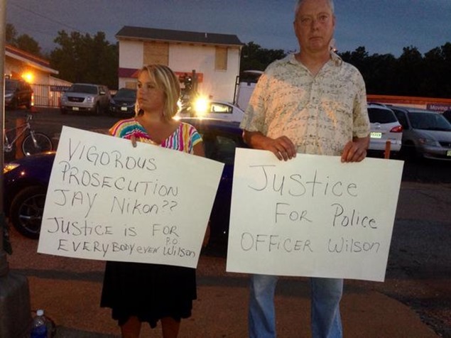 A white man and a white woman, daring to walk amongst a blood-thirsty crowd of black people salivating for the sacrifice of Officer Darren Wilson, boldly holding signs in support of a white police officer.