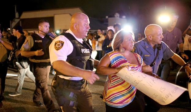 A video post to YouTube shows the woman and another man getting into a verbal argument with Brown protesters, before they were escorted from the scene by police. They are identified as Chuck and Dawn of St Louis, in the video’s caption.