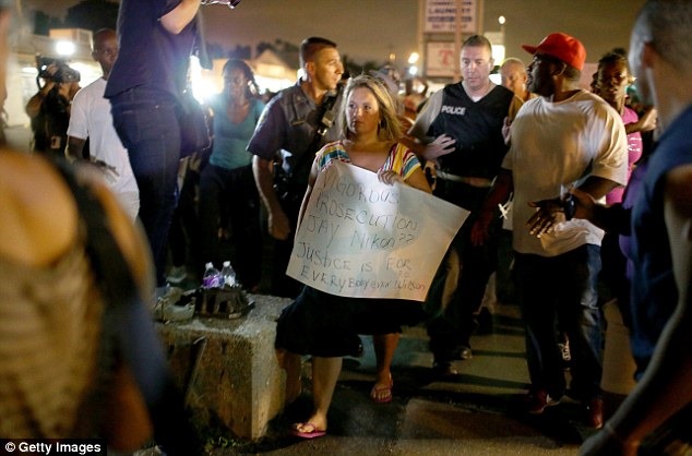 The small group of pro-Wilson supporters arrived after dark in the rally area, with one woman in a rainbow-striped shirt holding up a sign criticizing the governor’s reaction to the police-shooting death: ‘Vigorous prosecution Jay Nixon? Justice is for everybody even P.O. Wilson’.