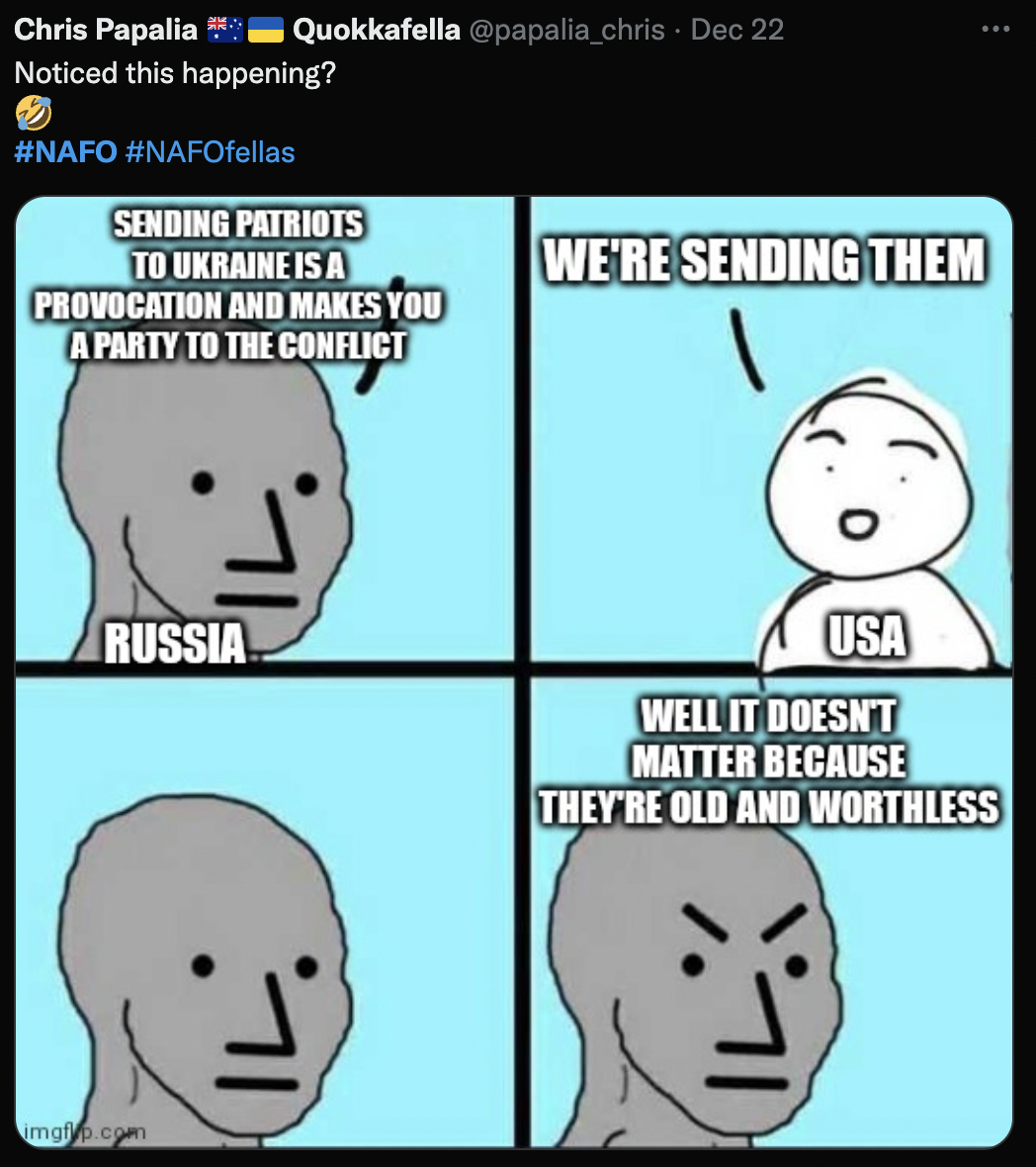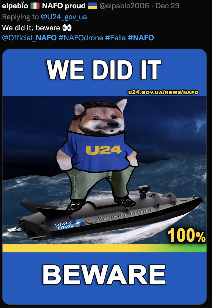 One of the wildest parts is that there is an organized CIA/State Department operation to promote the war in the Ukraine using doge memes. They call themselves “fellas” and their pro-NATO meme is “NAFO” – “The North American Fellas Organization.”