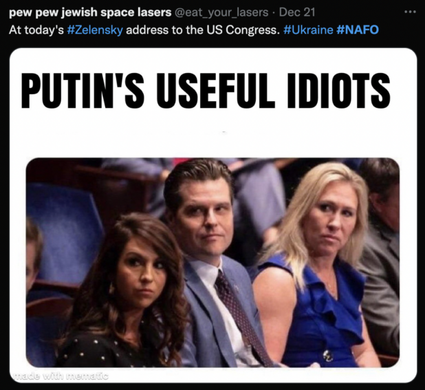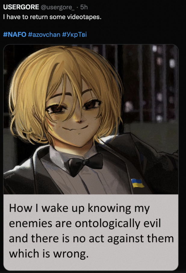 They aggressively promote the neo-Nazi “Azov” satanic death cult, though it’s not really clear that right-wingers are the target audience. It seems more about simply creating confusion, and the sense that there is a large body of normal people who support the Ukraine (and believe they are winning, which is the largest part of the larger disinformation campaign).