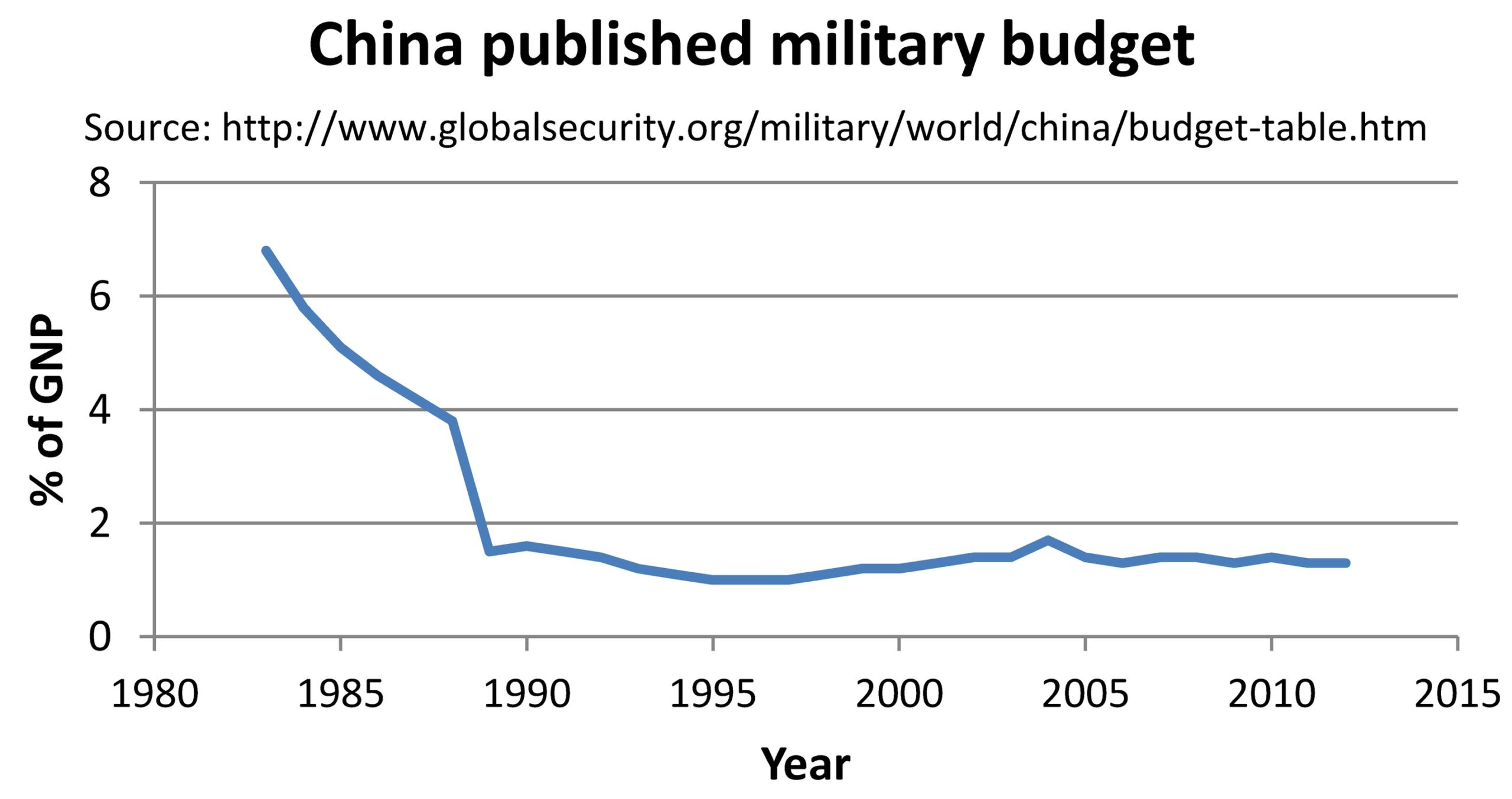 According to the World Bank (one of the main groups that keeps track of these things), China’s military budget as a percentage of its GDP has remained static since the 2000s, at around 1.8%.