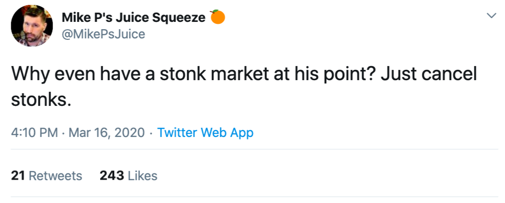 Mike Enoch was saying that the economic fallout would only affect “boomer 401ks,” and attempted to force-meme “stonks” as a way to mock people who were concerned about the economic fallout.