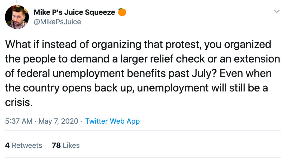 In this tweet you can also see that Hovater is claiming that all the lockdown means is that Applebee’s is closed. That tweet is less than a month old. This was the entire pattern of these neo-Nazis: they were all at once both instructing people to do whatever the government said and claiming that there would be no economic fallout from the complete shutdown of the economy.