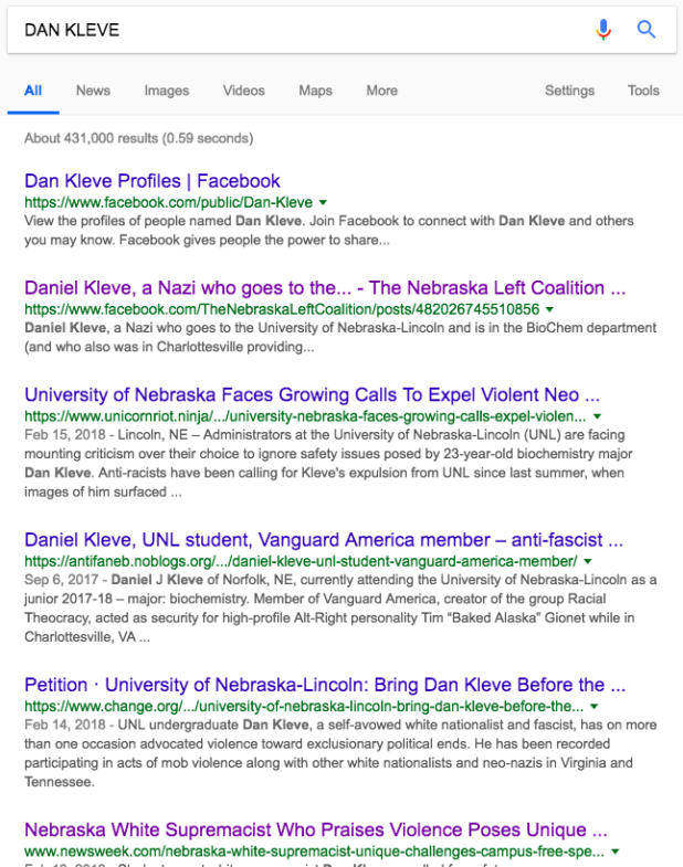 Plan B was to print a vile, defamatory hate piece, which would further enflame the mob, and lead to Kleve either being expelled or murdered. He wrote a longform article in an attempt to provoke a news cycle full of stories about Kleve. He included deranged fake news, such as rumors that he had secretly made threatening statements. The message of the article was that he is an immediate danger – that he is getting ready to start killing people – and that someone has to do something to stop him. Hayden could have simply written “GO KILL THIS MAN HE IS AN EVIL NAZI RACIST.”