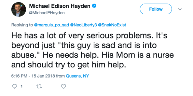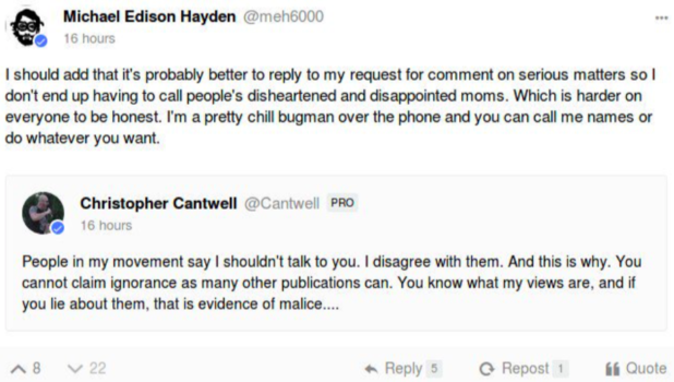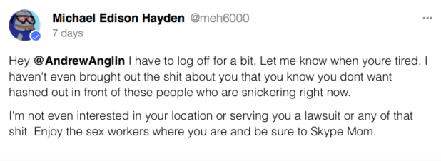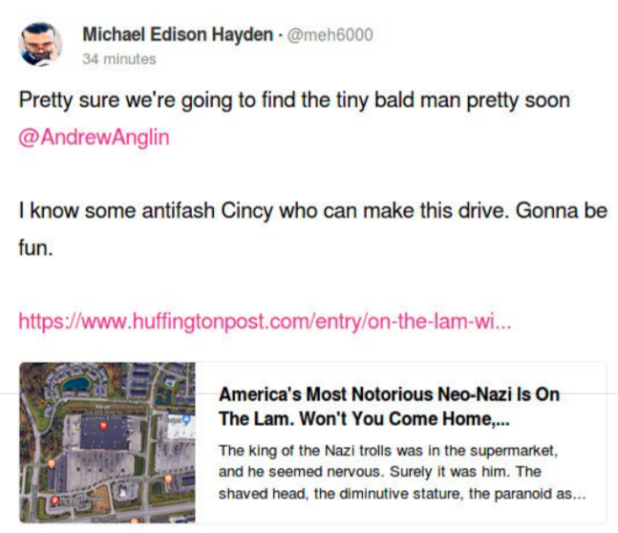 Another journalist, Newsweek’s Michael Edison Hayden, who recently had his 15 minutes of fame when he promoted an obviously fake tweet from a Julian Assange impersonator account, claims to be hunting me. He has publicly stated in a now-deleted social media post that he is going to send antifa to attack me.