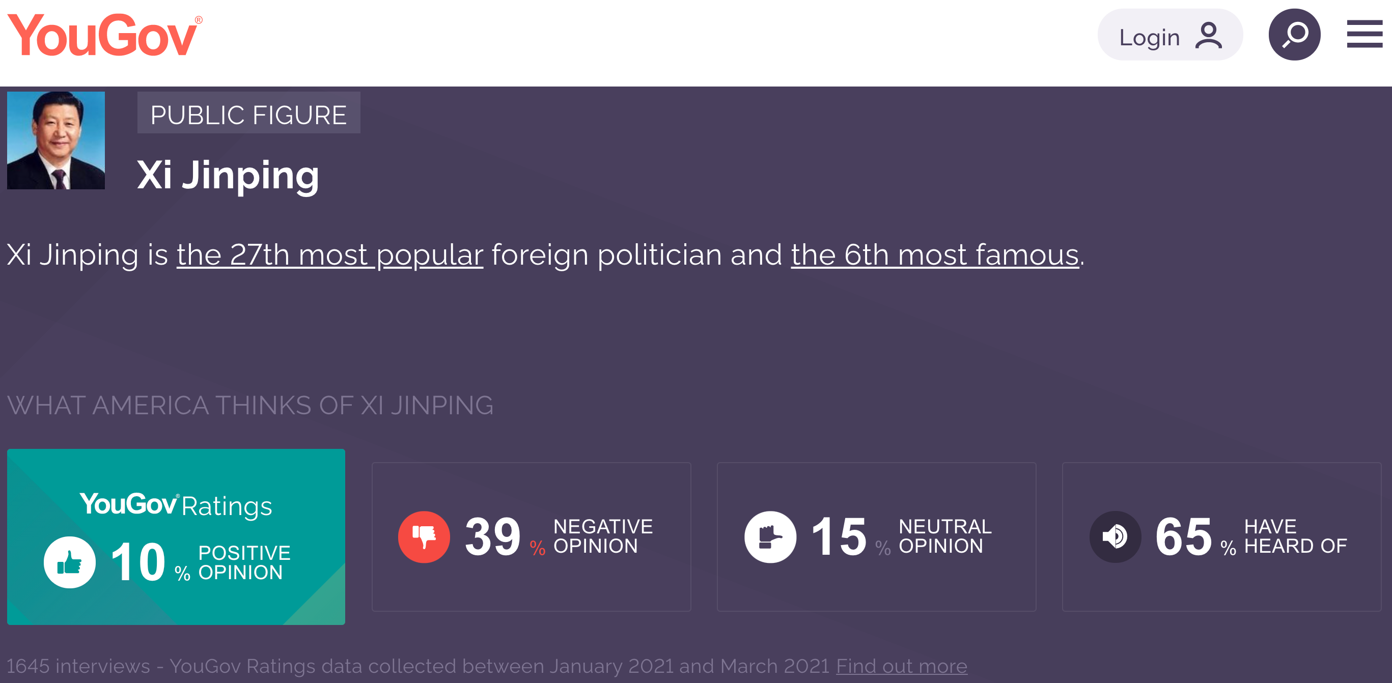 According to a YouGov study from earlier this year, only 65% of Americans have heard of Xi Jinping, while only 10% have a positive opinion of him.