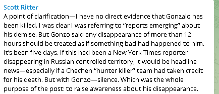 Coach should have done like Patrick Lancaster and embedded with the Russians. That has its own set of dangers, obviously, and Patrick risks his life every day, but at least if you get killed in that context, it’s not a mystery and you don’t have to worry about being captured and sent to some satanic torture dungeon.
