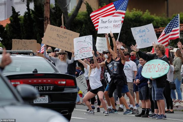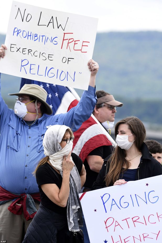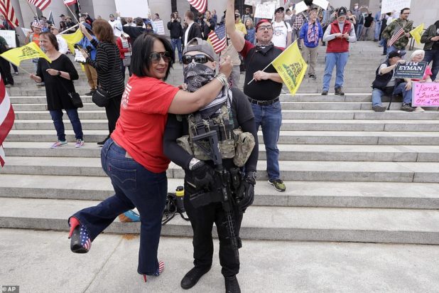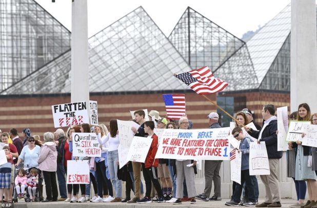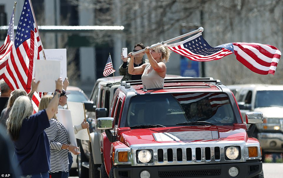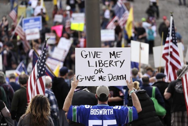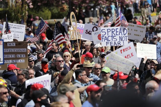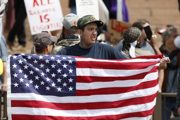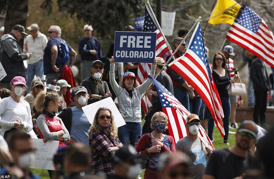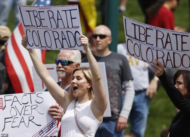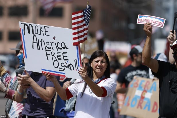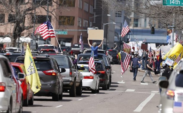 Titled ‘Operation Gridlock’, the day’s largest demonstration took place in Denver, where hundreds of protesters ignored social distancing guidelines to huddle together on the lawn of the state Capitol, waving flags emblazoned with slogans such as ‘Your “health” does not supersede my right’, ‘Freedom over fear’, and ‘I would rather risk coronavirus than socialism’.