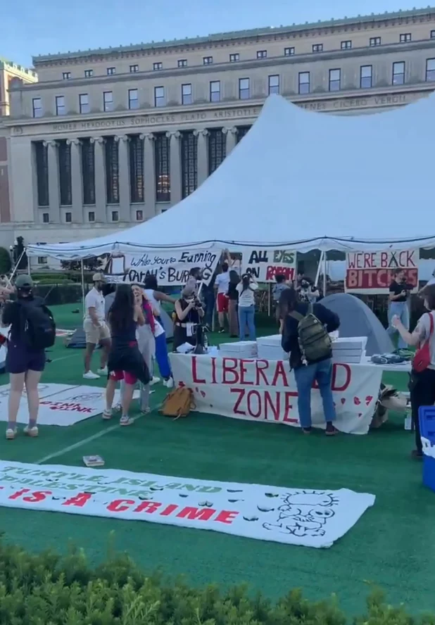 The defiant demonstrators — members of Columbia Students for Justice in Palestine — set up camp on the Manhattan campus’ south lawns alongside a giant white party tent already in place for the alumni event festivities that end Saturday.