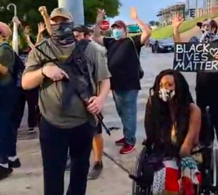 At a rally by the black-only ‘Not F**king Around Coalition’ (NFAC) in Louisville, Kentucky, gunshots rang out and two people were wheeled off by medics.Early reports suggest one of the militia members shot himself by accident.