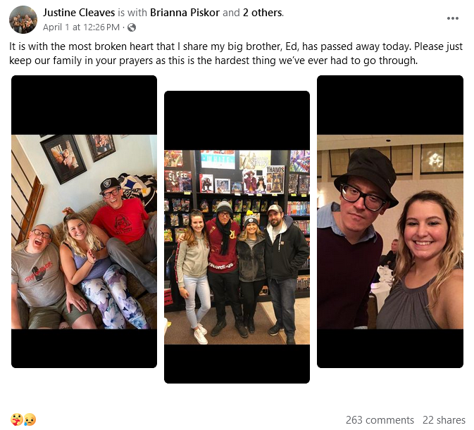 “It is with the most broken heart that I share my big brother, Ed, has passed away today,” his sister, Justine Cleaves, wrote on Facebook Monday. “Please just keep our family in your prayers as this is the hardest thing we’ve ever had to go through.”