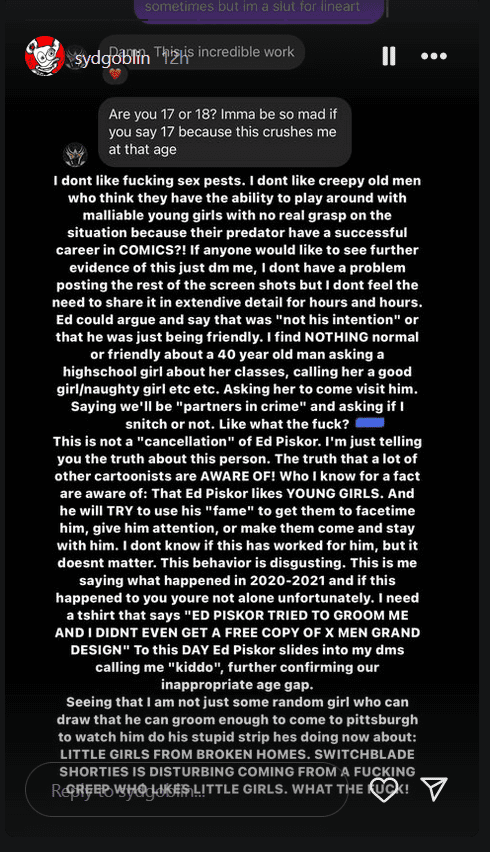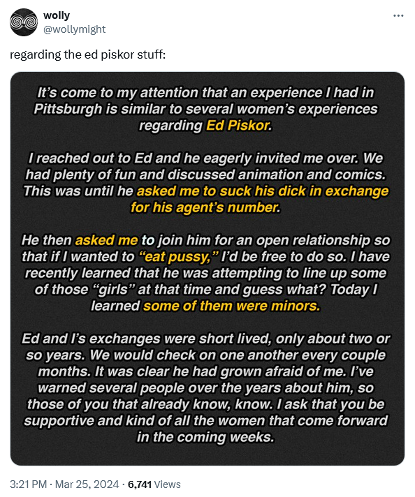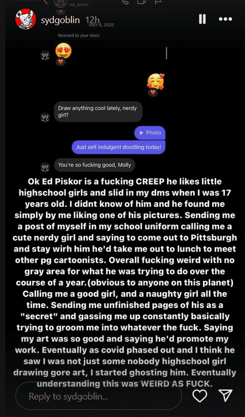 On March 25, a City Paper article repeated allegations by a Philadelphia-based cartoonist who had posted on social media screenshots of text messages sent to her by Piskor in 2020, when she was 17, and which she considered inappropriate and tantamount to “grooming.” The article also included a claim posted by another woman in a since-deleted thread on X, formerly Twitter, that Piskor had engaged in inappropriate behavior.