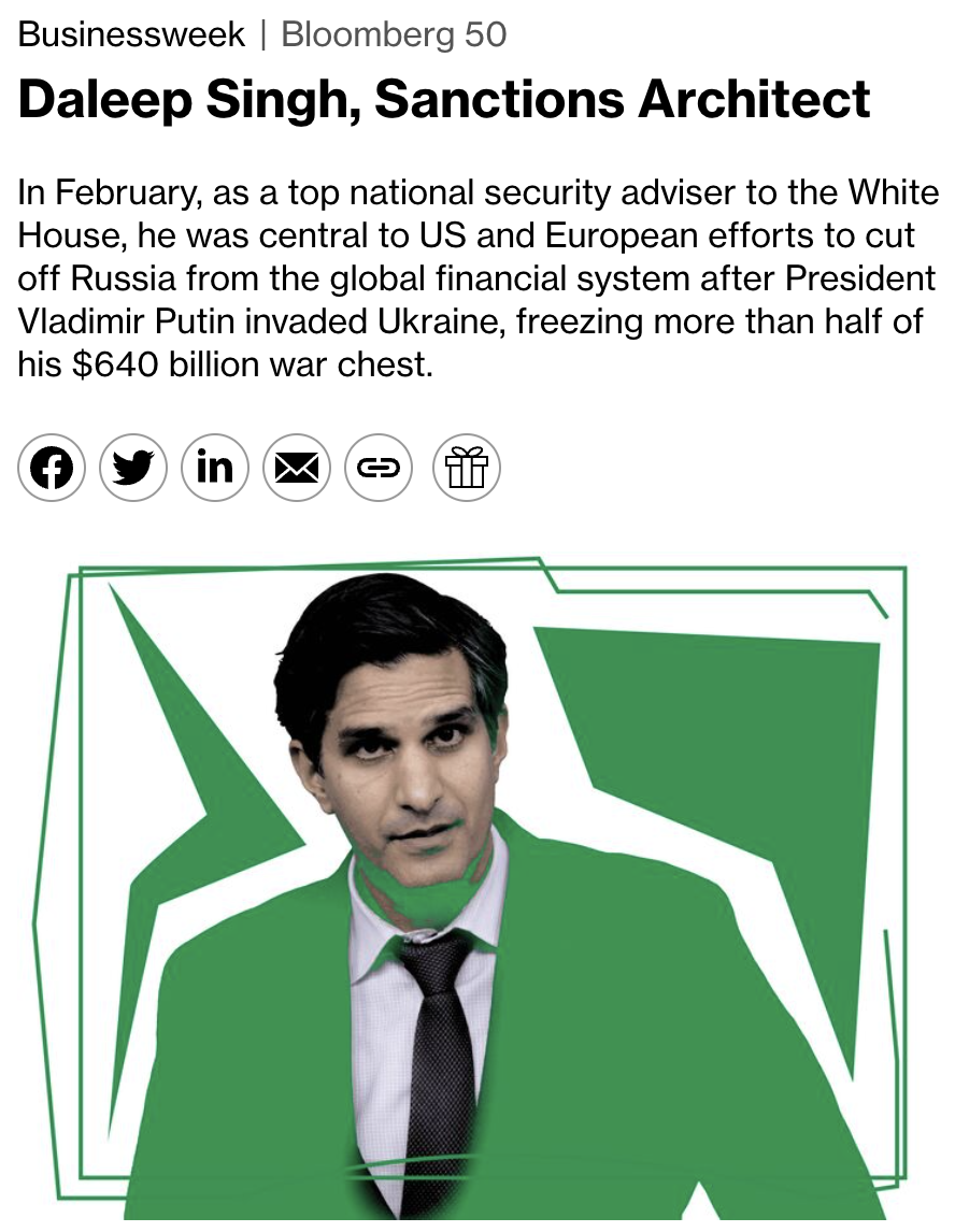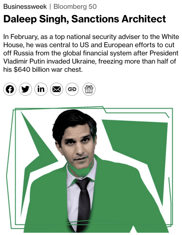 The Russian sanctions, which massively boosted the Russian economy while destroying those of US allies, were masterminded by a brown person at the White House, Daleep Singh.