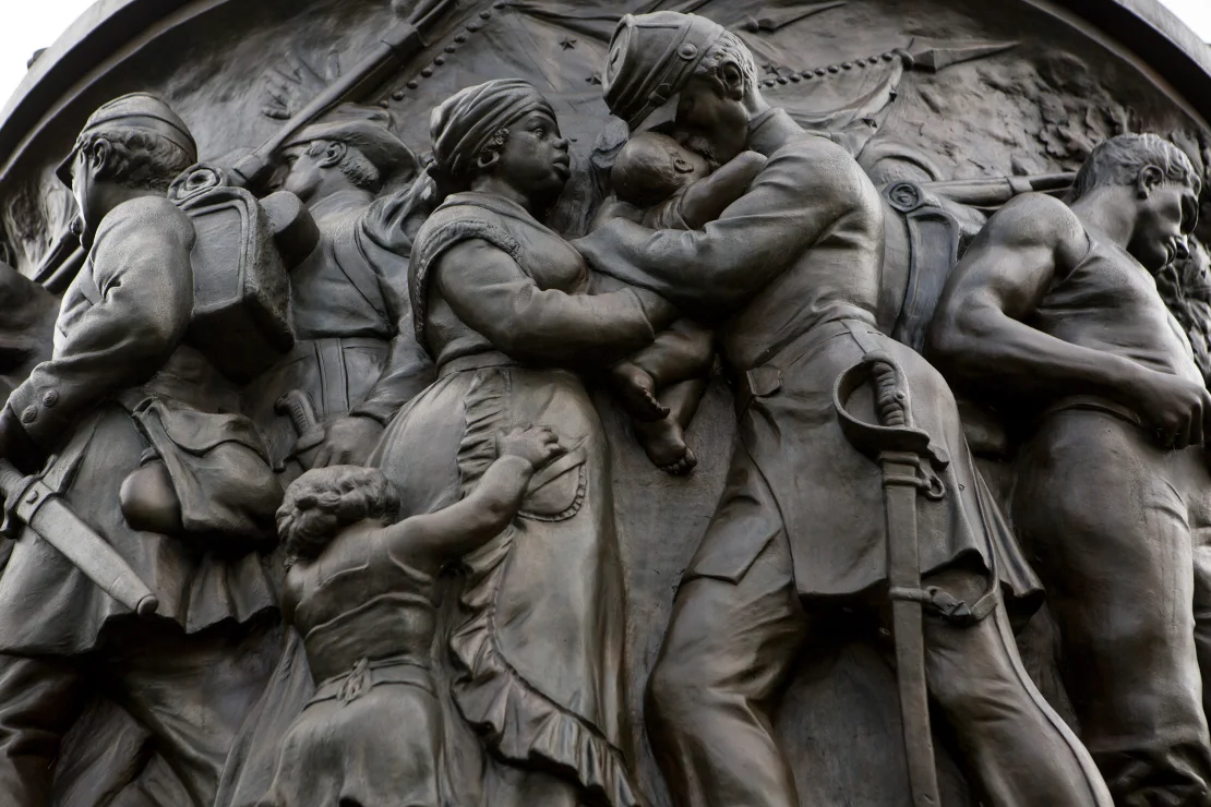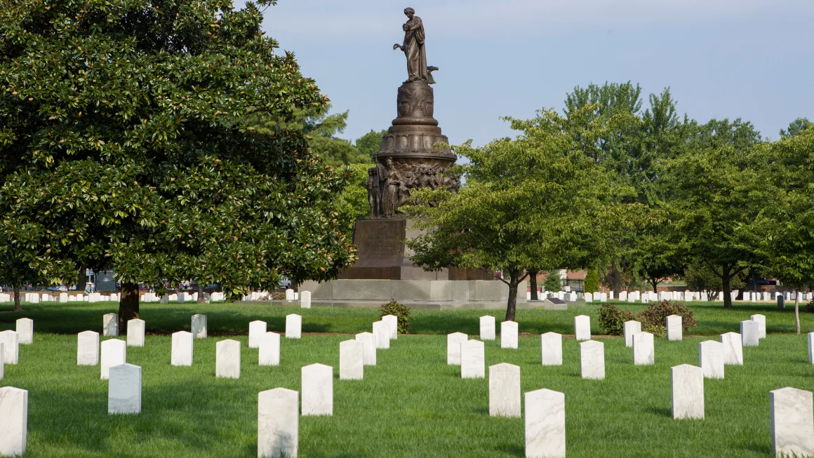 Other figures on the monument include a Black woman depicted as a “Mammy,” carrying an infant of a white officer, and a Black man following his owner to war, according to the cemetery.