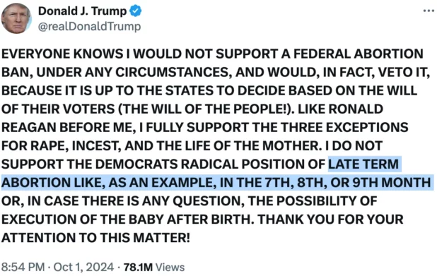 Again, Trump has said outright that he’s fine with abortion until six months.