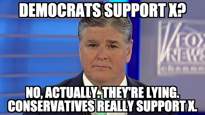 It doesn’t matter how deranged the leftist idea is: Sean Hannity will take that idea, and claim that “true conservatives” stand for that idea, and that Democrats are failing to do enough to promote that deranged idea.