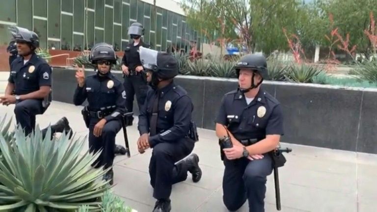Leading politicians have adopted the gesture, from Democratic presidential hopeful Joe Biden to the mayor of Los Angeles Eric Garcetti, who dropped to a knee along with a line of officers as they mingled with demonstrators near city hall on Tuesday.